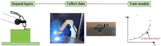 For the deposition, a six-axis Omron Adept Vipers850 robot was employed as a motion platform, while the welding equipment comprised a Miller Pheonix 456 welding machine. The final bead geometry at each layer was measured using a Lext 5100 laser scanning confocal microscope. The workflow employed to collect the data is reported in Figure 6, and allowed to obtain the necessary labels for the supervised learning task.