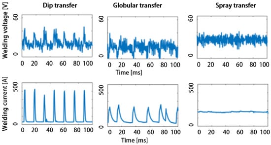 Comparison of the welding voltage and welding current signals for different transfer modes obtained by employing a different set of input factors.