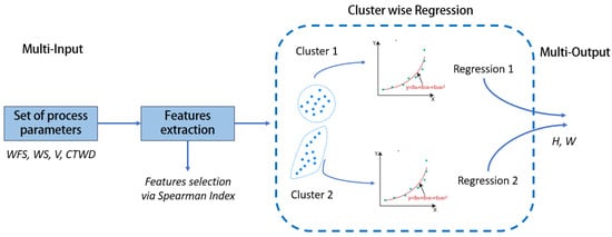 In the context of a welding-based process such as WAAM, the utilization of cluster-wise regression becomes particularly advantageous due to the diverse impacts that different sets of input factors can have on the heat input delivered to the material and the subsequent heat accumulation. By identifying and accounting for these variations through clusterwise regression [50,51], it is possible to better capture the hidden relationships between input factors and welding outcomes. This not only reduces model complexity and guards against overfitting but also enhances the model’s capacity to generalize across various welding scenarios, leading to more robust and reliable predictive capabilities. Let us first consider a classical linear regression