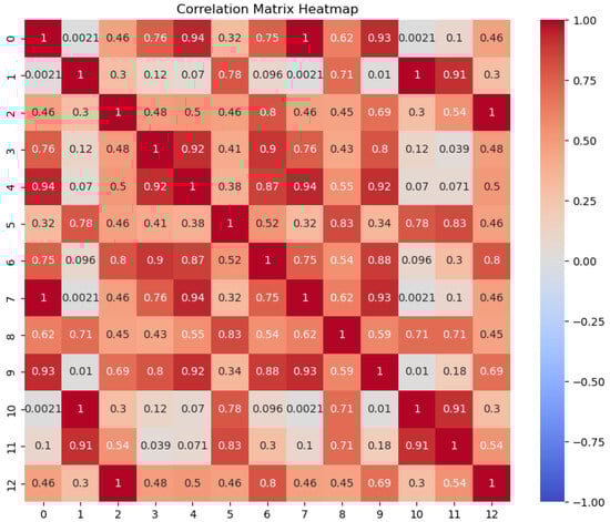 Starting from the four input factors of Wire Feed Speed (), Welding Speed (), Contact-To-Workpiece Distance (), and Welding Voltage (), fourteen features were extracted as described in the previous section to develop the second order multivariate polynomial regression. The Spearman correlation index () was computed by conducting Spearman correlation analysis; the associated color map is shown in Figure 9. From these computed correlations, only those features that presented a low correlation with the others were maintained, thereby avoiding problems related to multicollinearity. At the end of preprocessing, the preserved features were , for a total of nine features. The extracted features were normalized and scaled in the range of 0–1 using Equation (11) for each feature j of the dataset.