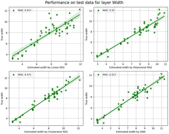 Regression plot of the relationship between the predicted and true values of the layer width for the different models developed in this study (source: own elaboration).