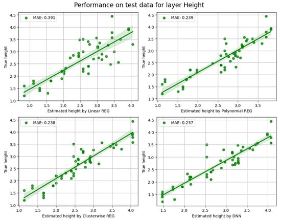 Regression plot of the relationship between predicted and true values of the layer height for the different models developed in this study (source: own elaboration).