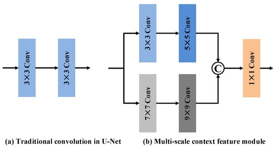 In Figure 2a, the encoding and decoding modules within the U-Net are composed of a traditional convolution block. This block is structured with two consecutive 3 × 3 convolutional layers. While this design maintains the simplicity and efficiency of fixed-size kernels, it inherently restricts the network’s capacity to capture broader contextual information and distant dependencies across the image. This limitation is particularly significant in the domain of medical imaging, where the size of lesions and abnormalities can vary dramatically from one case to another. Moreover, medical images often have complex textures and varying scales of anatomical structures that require a multi-scale approach for accurate segmentation. To solve the above difficulties, the traditional convolutional blocks in the U-Net are replaced with multi-scale context feature modules. As illustrated in Figure 2b, the multi-scale context feature module employs a dual-branch asymmetric convolutional combination to optimize performance within the constraints of limited computational resources. This innovative design aims to extract richer semantic information and generate more detailed feature maps. In the upper branch of the network, a combination of 3 × 3 and 5 × 5 convolution is utilized. These smaller convolution kernels can efficiently capture details and local features in an image, and they provide a balance between computational efficiency and detailed feature extraction, ensuring that the network can process high-resolution images without excessive computational load. The lower branch of the network adopts a combination of larger 7 × 7 and 9 × 9 convolutions. These larger kernels expand the network’s receptive field, and they are able to capture more contextual information and understand a wider range of spatial relationships in the image. By incorporating these larger convolutions, the network can better interpret complex scenes and accurately segment objects that vary significantly in size and shape. To ensure that the information extracted from the two branches can be effectively integrated, the features extracted from the upper and lower branches are added together. Then, we put the combined features through 1 × 1 convolution to recover the number of channels and fuse the information from all channels. In summary, the multi-scale context feature module adopts a two-branch asymmetric convolution design, which effectively balances the need for detail feature extraction with computational efficiency. By integrating convolution and fusion mechanisms of different sizes, our module captures a wide range of semantic information and enhances the overall performance of the network in complex image segmentation tasks.