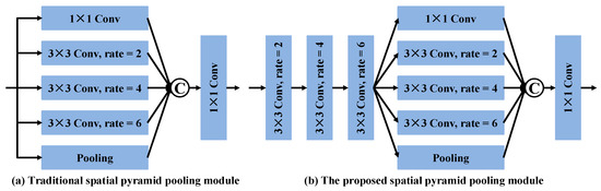 As depicted in Figure 3a, the spatial pyramid pooling structure effectively captures multi-scale information by utilizing expansion coefficients of various sizes. In this architecture, feature extraction is handled by separate branches, each dedicated to a specific scale. At the conclusion of the network, the information from these distinct branches is fused and outputs them by a convolution layer. This method is particularly effective in avoiding the problem of redundant information acquisition within the encoder and focuses on identifying and analyzing the correlation between different objects. Inspired by the principles of pyramidal structures [13,14] and the techniques used in atrous convolution [15,16], we designed an advanced spatial pyramid pooling module. This module is strategically positioned at the bottom of the encoder, as depicted in Figure 3b, to significantly improve the network’s ability to obtain and interpret spatial relationships within the images. Specifically, our SSP module operates sequentially using three convolutional layers, each with different expansion rates of 2, 4, and 6. The first layer, with a scaling rate of 2, focuses on capturing finer details, while subsequent layers, with scaling rates of 4 and 6, progressively capture broader contextual information. This design allows the network to effectively gather context information at different scales, which can enhance its ability to detect local and global features in images. After multi-scale convolution, a cascade extended convolution module is introduced. This module includes multiple branches: a 1 × 1 convolution branch for fine-grained feature extraction; a 3 × 3 convolution branch for multiple different expansion rates for collecting different attributes; and a pooled branch for summarizing feature maps. The outputs of these branches are then connected to form a comprehensive feature map that integrates multi-scale information. Next, the concatenated feature maps undergo channel adjustment through a 1 × 1 convolution to harmonize the number of channels. This adjusted feature map is subsequently fed into the decoder, ensuring that the decoder receives a rich and well-integrated representation of the input image. The main advantage of the SSP mechanism is that multi-scale information can be obtained through natural convolution at different expansion rates, which effectively compensates for the global feature information lost during continuous downsampling. By capturing and retaining a wide range of features, the SSP module can improve the overall segmentation accuracy and robustness.
