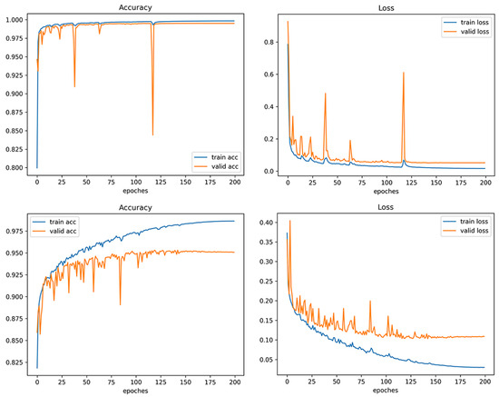Loss and accuracy curves of MSCF-Net on training and verification. The first row: results on SeaShipsSeg dataset. The second row: results on MariBoatsSubclass dataset.