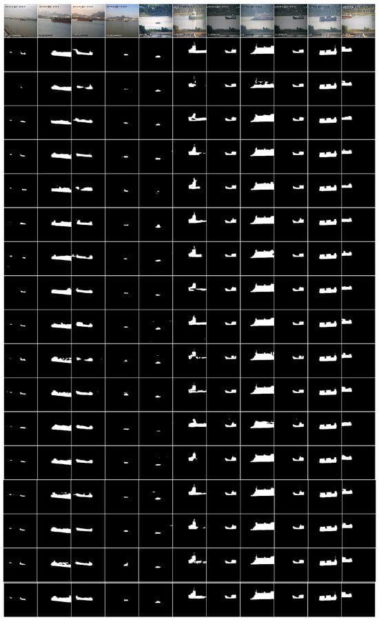 The SeaShipsSeg [9] is an advanced and meticulously curated collection designed specifically for ship segmentation tasks. It is derived from the famous ship target detection database SeaShips [20], which is known for its comprehensive coverage of ships at sea under various conditions. Zhang et al. carefully selected the images and labeled them using Labelme 3.16.7 software to ensure the accurate delineation of ship boundaries. To enhance the robustness and generalization of segmentation algorithms, they introduced simulated degradation effects such as haze, rain, and low-light conditions. Figure 6 provides a visual illustration of the ships in the SeaShipsSeg dataset and their corresponding annotations. In our study, we set up 768 for training, 192 for validation, and 240 for testing. The dataset can be downloaded at https://github.com/GrimreaperZ-creator/SeaShipsSeg, accessed on 1 May 2024.