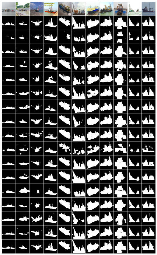 Sun et al. undertook the task of creating a comprehensive ship segmentation dataset by sourcing image data from the Google image platform. They meticulously used Labelme 3.16.7 software to segment and label these selected ocean ship images to obtain the segmentation dataset of ship instances, which was named MariBoatsSubclass [10]. To improve the generalization ability of the algorithm under different conditions, at least one of the data enhancement methods of horizontal flipping, scaling, and multi-scale input was used to expand the dataset. The total number of MariBoatsSubclass dataset images is 3125, which can meet the basic case segmentation requirements. Figure 7 provides a visual illustration of the ships in the MariBoatsSubclass dataset and their corresponding annotations. For the initial stage of training, this dataset was divided into three parts: 624 images for testing; 1876 for training; and 625 for verification. This dataset can be obtained from https://github.com/s2120200252/Visible-ship-dataset, accessed on 1 May 2024.