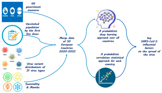 Even if the SARS-CoV-2 pandemic recedes, research regarding the effectiveness of government policies to contain the spread of the pandemic remains important. In this study, we analyze the impact of a set of epidemiological factors on the spread of SARS-CoV-2 in 30 European countries, which were applied from early 2020 up to mid-2022. We combine four data sets encompassing each country’s non-pharmaceutical interventions (NPIs, including 66 government intervention types), distributions of 31 virus types, and accumulated percentage of vaccinated population (by the first five doses) as well as the reported infections, each on a daily basis. First, a Bayesian deep learning model is trained to predict the reproduction rate of the virus one month ahead of each day. Based on the trained deep learning model, the importance of relevant influencing factors and the magnitude of their effects on the outcome of the neural network model are computed by applying explainable machine learning algorithms. Second, in order to re-examine the results of the deep learning model, a Bayesian statistical analysis is implemented. In the statistical analysis, for each influencing input factor in each country, the distributions of pandemic growth rates are compared for days where the factor was active with days where the same factor was not active. The results of the deep learning model and the results of the statistical inference model coincide to a significant extent. We conclude with reflections with regard to the most influential factors on SARS-CoV-2 spread within European countries.
