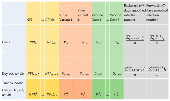 Each input for training the model is constituted by averaging the values of all explanatory variables (Table 2) over the upcoming days from a day i in a country, as depicted in the last row in Figure 2 and explained as follows.
