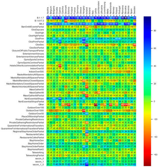 The four datasets are merged into a unique pandas table, referred to as data_encoded. Each row of data_encoded represents each day in the time span between 2020 and mid 2022 for a specific country. Data_encoded consists of 22,420 rows. Each country (from 30 countries) comprises its own block of approximately 750 rows (22,420/30 = 750 days) in data_encoded. The columns of data_encoded comprise 111 columns representing the pandemic explanatory factors as well as 2 columns representing the 7 days’ average backward and 7 days’ average forward number of reported infections at any arbitrary day for each country. These are shown in Table 2 and are explained in the following Section 3.1, Section 3.2, Section 3.3, Section 3.4 and Section 3.5.