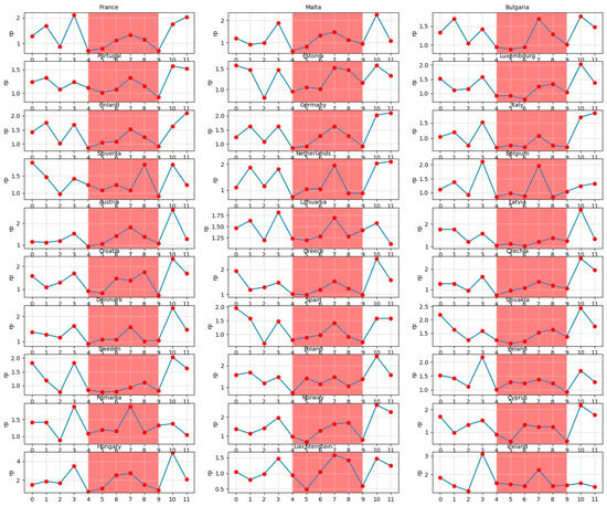 Figure 11 illustrates the month-wise computed PDPs covering the counterfactual scenarios of all months of the year being set each time to a specific month ranging from 0 (December) to 11 (November). In Figure 11, a specific period of the year for each country between the month 4 (April) and the month 9 (September) is highlighted in light-red as it demonstrates the season belonging relatively to the warmer times within the year.