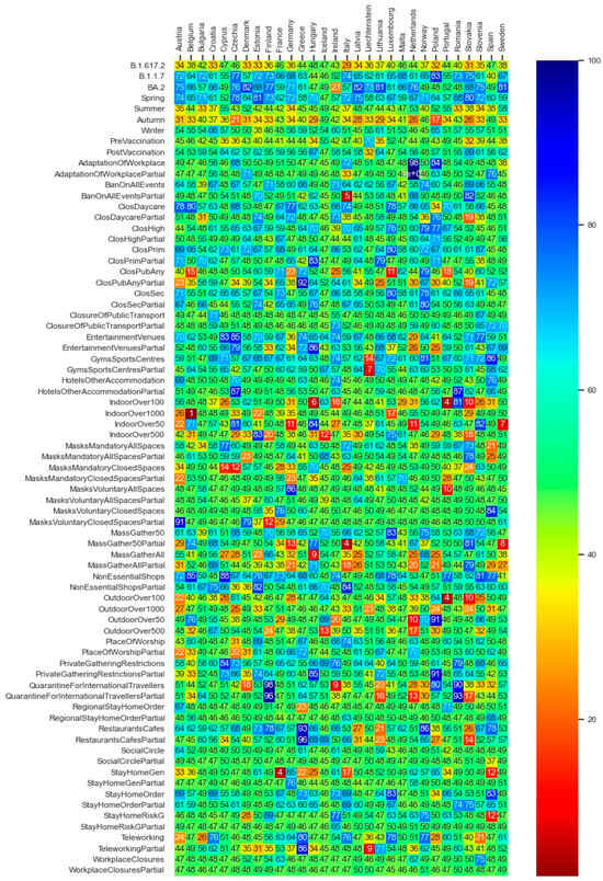 In order to summarize the statistical inference for each explanatory variable (depicted in Figure 12), the average of the efficiencies over the entire 30 countries is computed and illustrated in Table 5. In Table 5, explanatory variables with higher than 50 percent efficiency values (e.g., the season Spring and the alpha variant) can be interpreted as effective factors with regard to pandemic containment. In contrast, explanatory variables (e.g., the season Autumn or the omicron variant) with under 50 percent efficiency values can be interpreted as effective factors with regard to pandemic growth.