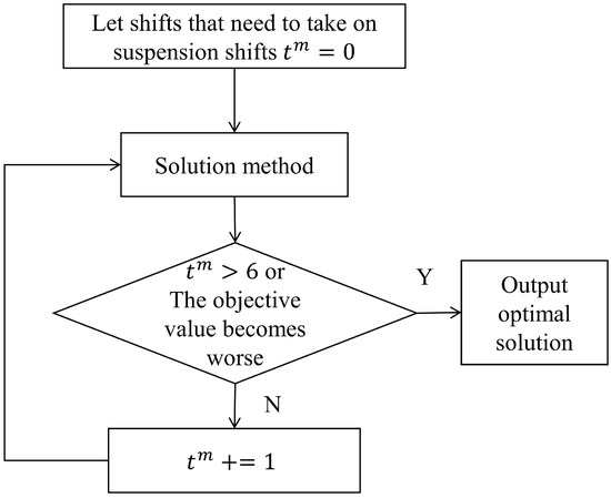 Most manufacturing companies operate on a two-shift system, dividing each day into two 12 h shifts (day and night). When planning a suspension shift schedule, it is necessary to schedule the production of current jobs and determine the shifts during the week when suspension should occur. However, to keep the production line running, the shop must ensure at least four working days per week, allowing for no more than six suspension shifts. Since the objective of this study is to minimize the weighted sum of job earliness and tardiness, we aim to maximize the number of workshop suspension shifts without worsening this objective value, achieving capacity optimization and on-time delivery of orders. Let represent the number of suspension shifts required. The problem then transforms into finding the optimal solution for collaborative optimization by starting from and incrementally adding one suspension shift until the objective value worsens or the number of suspension shifts exceeds six , as shown in Figure 2. Additionally, if a day is divided into three, four, or more shifts, the algorithm can still be applied by simply recalculating the number of shifts and adjusting the constraints on according to the specific situation. For example, three shifts means that a shift is 8 h, and can be calculated accordingly.