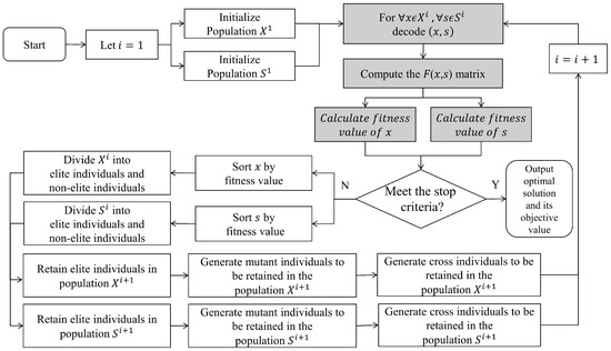 First, the solution population and scenario population are initialized through random number encoding, with the current iteration number set to , as described in Section 4.1. Each pair of individuals formed from the two populations is decoded in Section 4.2 to calculate the objective function of the complete scheduling solution, where and . The calculation of the objective function for each pair yields the matrix . Next, based on the objective function matrix , the fitness values of all solutions and scenarios are calculated and sorted according to their fitness values. Considering the differences in risk identification and management capabilities among decision-makers, two types of individual fitness evaluation methods are proposed. Detailed information is introduced in Section 4.3. Finally, all individuals in the population are divided into elite and non-elite individuals. The population is evolved by retaining elite individuals, mutating individuals, and crossing individuals into the next-generation population, as shown in Section 4.4.