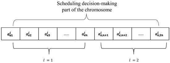 For the matrix , the j-th number of the e-th row is denoted as . Thus, the matrix can also be represented by each row , . Each row in the matrix contains 2n real numbers, as shown in Figure 4. For convenience, by treating the processing of each stage of n jobs as a separate job, these 2n real numbers represent the scheduling information for 2n jobs. Decoding these 2n real numbers yields the scheduling decision plan. Among them, jobs represent the processing of n jobs in the first stage, and jobs represent the processing of n jobs in the second stage. That is, when , and respectively represent the encoding of the first- and second-stage processing information for the same job.