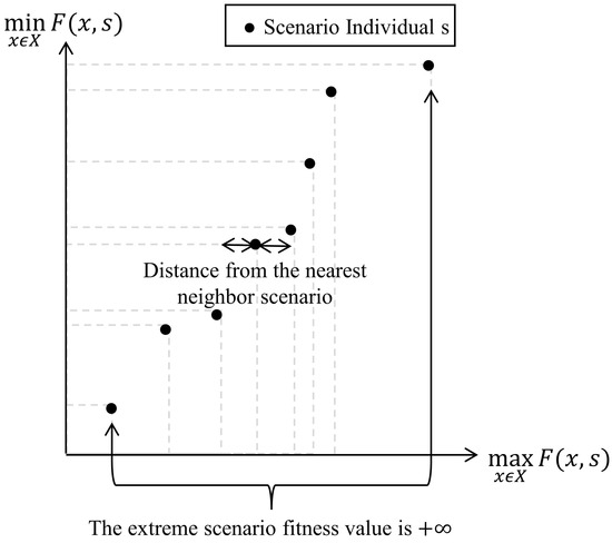 Within the dual-space co-evolutionary algorithm framework, the evolution objective of the scenario population should focus on enhancing diversity. This diversity ensures that the algorithm maintains the robustness and effectiveness of its solutions when facing a wide range of changing environments. To make the scenario population more diverse, the fitness value of a scenario individual is transformed into its contribution to the population’s diversity. This is determined by calculating its distance from other scenarios. The method of calculating the distance is based on feature generation, where scenario individual s is mapped in a two-dimensional space based on two relevant features, as shown in Figure 5: one is the maximum value of the objective function revealed by the solution population X, , and the other is the minimum value . For each feature, scenarios representing extreme values are given high fitness values to encourage expanding the “space” occupied by the population. For the remaining scenarios, the two nearest scenarios are identified, and the product of their distances is calculated. The fitness value of a scenario is the maximum product of the distances along the two axes, giving preference to scenarios that fill gaps in the population space.