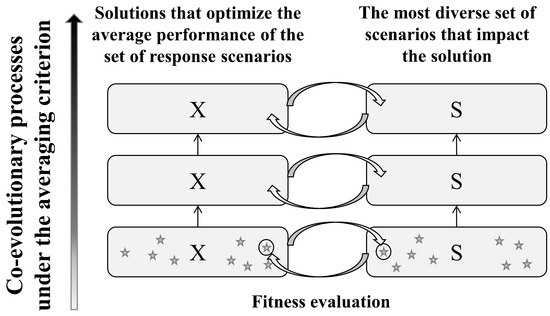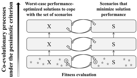 In conclusion, the evaluation of individuals within a population using an average criterion is designed to identify the solution that exhibits the optimal average performance across various scenarios throughout the evolutionary process. The objective of evaluating scenarios is to assemble a set of scenarios that collectively exert the most diverse influence on the solutions, as illustrated in Figure 6. The star signs represent individuals in each population. Consequently, the evolution of solutions is framed as a minimization problem, where individuals from the solution population are ranked in non-decreasing order based on their fitness values. Conversely, the evolution of scenarios is considered a maximization problem, necessitating that individuals from the scenario population be ranked in non-increasing order of their fitness values.