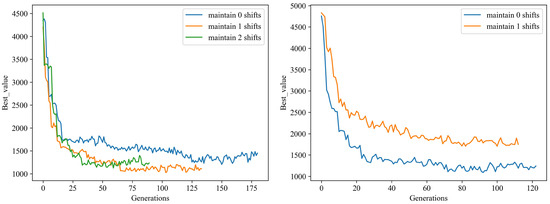 In this work, we assume that all workshop suspension shifts have the same priority. However, if we prioritize suspension shifts during rest days to reduce overtime, the model could have broader practical applications. Additionally, our current approach sets the objective as , effectively balancing the conflicting objectives of minimizing earliness and tardiness through a weighted sum. While this method addresses these objectives within a single optimization framework, it does not fully explore the potential of multi-objective optimization, particularly in terms of generating a Pareto frontier of optimal solutions. Future work could focus on developing algorithms that explicitly consider Pareto-optimal solutions, offering a more comprehensive analysis of the trade-offs between multiple objectives. Moreover, optimizing the algorithm to reduce computation time remains crucial. Currently, evaluating the fitness of all individuals results in high computational costs, whereas sampling too few individuals increases the algorithm’s randomness. Therefore, effective sampling strategies and fitness evaluation are important areas for further exploration to enhance the algorithm’s efficiency and robustness.