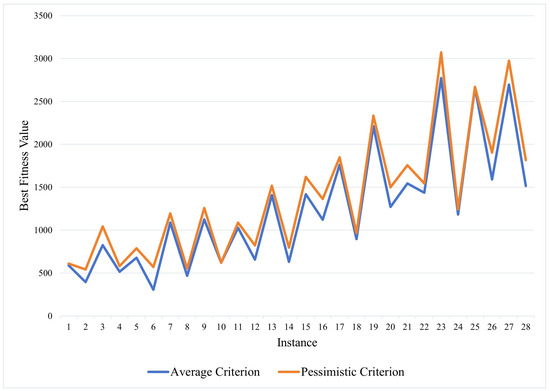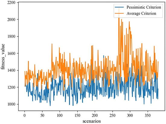 The average criterion guides decision-making by considering the overall effect across all possible scenarios. It calculates the expected values of all potential outcomes to find the solution that performs best on average. This approach is especially suitable for risk-neutral decision-makers. Specifically, for the set of all possible processing time scenarios S and the set of all feasible solutions X, the objective function describes the weighted sum of earliness and tardiness for a particular solution x under a specific processing time scenario s. The fitness value of solution x can be determined by calculating the unweighted average of its objective function across all scenarios, as shown in Equation (26).