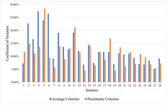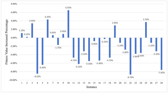 Since the generated scenarios only have boundary information for processing times, it is difficult to assess the accuracy and representativeness of the generated scenarios. Nonetheless, we can measure them based on the precision. A representative scenario population should have a similar impact on the solutions. To test this, we evaluated the best solution found for each data instance using both the final generation’s P scenario from the same run and scenarios generated from ten runs. By calculating the fitness value increase percentage (), we compared the differences in fitness values for the best solutions from these two sets of scenarios, as shown in Equation (33), where S represents the set of P scenarios from the final generation of the same run, and represents the set of scenarios generated from ten runs.