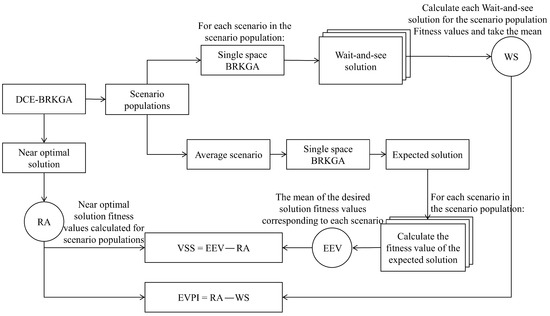 To further verify the potential value and efficiency of the DCE-BRKGA, the expected value of perfect information as a percentage () is used to evaluate the value of obtaining perfect information. This value is defined as the degree of deviation between the RA obtained by the DCE-BRKGA and the WS obtained by the “wait-and-see” method and is calculated as: