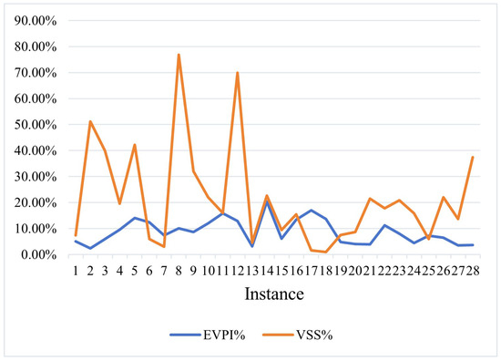 This study uses 28 data instances to calculate the EVPI and VSS, and the results are shown in Table 7 and Figure 13. For the EVPI, the results indicate that if uncertainty is eliminated, potential improvements of 2.4% to 20.3% can be expected, assuming the scenario population is representative and decisions are made. This value is very useful for manufacturers as it helps them understand the value of investing in better prediction methods.
