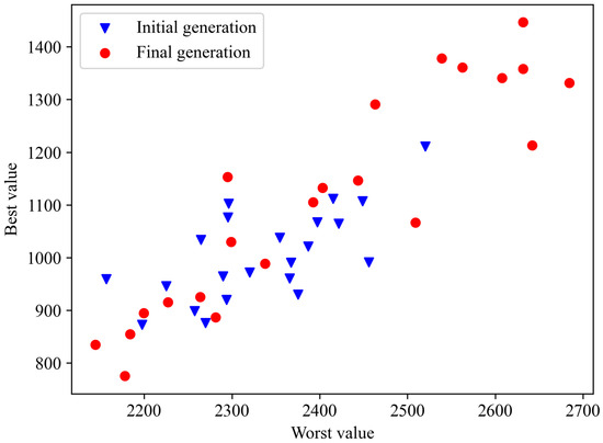 The diversity of the scenario population relates to the calculation of the scenario fitness values introduced in Section 4.3.1. Figure 14 uses the previously introduced two-dimensional coordinate system, as shown in Figure 5, where each scenario in the population is mapped based on the worst and best fitness values it “causes” in the solution population. This figure compares the initial and final generations of the scenario population as mapped within the final solution population. Compared to the initial scenario population (blue triangles), the final generation (red circles) occupies a larger “space”, with greater distances between scenarios, indicating higher diversity. The population’s skewed distribution is because the two features used to map scenarios are correlated; higher worst fitness values tend to accompany higher best fitness values. Considering that the solution population tends to converge towards similarly well-performing solutions, we do not expect to see a single scenario simultaneously adversely affecting one solution while benefiting another in the final generation.