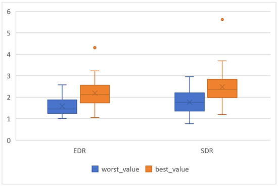 Table 9 and Figure 15 show that, on average, the final generation’s EDR on the worst-fitness-value axis is 1.58 times that of the initial generation, with the SDR 1.76 times greater than that of the initial generation. On the best-fitness-value axis, the EDR is 2.19 times greater and the SDR is 2.47 times greater than for the initial generation. These results indicate that population diversity has improved in both dimensions, with a more significant improvement in the best-fitness-value dimension.