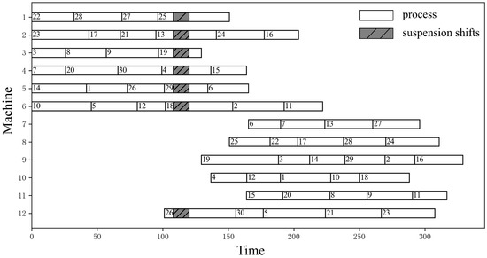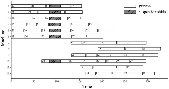 Suspension shifts are crucial for enterprises to adapt to market demand changes and to regulate production capacity by controlling working hours, ensuring on-time order delivery. In actual production, demand fluctuates. When demand is below maximum capacity, suspension shifts reduce production capacity, minimizing machine idle time, operational costs, and inventory due to early completions. Considering that in a production workshop, most processes involve human–machine collaboration and are influenced by fixed work schedules and shift handovers, the decision to suspend operations must be made according to the shift. Additionally, suspending all machines in the workshop simultaneously can maximize cost reduction, so all operations in the same workshop should be suspended according to the same shift. Therefore, production planning typically schedules workshop suspension shifts based on actual orders, creating non-production periods that constrain workshop scheduling.