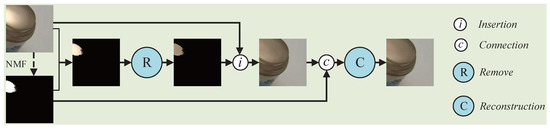 where and denote the material diffuse and specular reflections, and represent the illumination intensity, n and l represent the normal vector and the direction of the incident light, v indicates the observation direction, refers to the fully reflected light direction, and indicates the shininess of the surface material. This model can be widely applied to represent real-life specular highlights, where in the highlight region is set to 1 since it can be considered approximately equal to the spectrum of the light source. Based on the widely used dichromatic reflection model [30], we can combine the NMF method proposed by [23] to denote the highlight mask by the following method. A color image I can be defined as , where D is similar with and indicates diffuse components, and S denotes specular reflection components and is analogous to . In the RGB response of an image, the above combination can be decomposed as follows:
