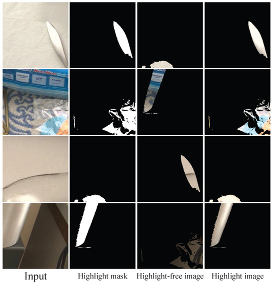 The formation of specular highlights is a complex physical phenomenon, resulting in significant challenges in establishing effective physical models. Despite the availability of numerous illumination models, the specular reflections generated by diverse materials and lighting conditions introduce substantial uncertainty. Conventional methods for addressing this issue can be broadly classified into two primary categories: multi-image and single-image techniques. Multi-image highlight removal methods typically utilize viewpoint dependence, leveraging several images to identify and separate specular and diffuse pixels [4]. While these methods yield superior performance, they are computationally intensive. Single-image highlight removal confronts more complex situations, necessitating the establishment of specific assumptions or conditions. They mainly consist of specific types of images [5,6,7,8], and the estimates of illumination, reflectance, geometry, and surface material properties [9,10,11,12,13,14,15,16,17,18,19]. However, the current methods for image highlight removal are susceptible to the erroneous classification of white regions as highlights, particularly in complex real-world situations.