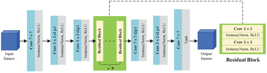 The overall architecture of our proposed three modules is based on Hu et al. [43], as depicted in Figure 4. This framework commences with three convolutional layers responsible for downscaling operations, followed by nine residual blocks [44] that serve to extract intricate features. The network concludes with three distinct convolutional layers, which are tasked with generating the output image. Notably, instance normalization [45] is consistently applied after each convolutional layer to preserve the preservation of unique image details. The discriminator component is a direct realization of the PatchGAN model [46], ensuring precise discrimination of the authenticity of the generated images. Additionally, the notation (P1) represents the first pixel-wise operation within our network architecture. This operation occurs after the initial convolutional layer and plays a crucial role in processing the input features before they are passed through the subsequent layers of the network. For clarity, the filter bank sizes for all convolutional layers are as follows: first convolutional layer: 64 filters, second convolutional layer: 128 filters, third convolutional layer: 256 filters, and fourth convolutional layer: 512 filters (with a kernel size). We have intentionally used a kernel size for this layer. The reason behind this choice is to capture a larger receptive field in the deeper layers of the network, which can be beneficial for extracting more complex and abstract features from the input data. This larger kernel size allows the network to learn richer representations by considering a broader context in the input feature maps.