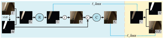 where M covers the regions of that have content, and ⊕ represents concatenation operation. The reconstruction module C also adopts the same network architecture as G and R, except that the input is a 4-channel tensor containing an additional 1 channel for the mask M. Subsequently, we use the pixel loss to encourage the final output image to be consistent with I,