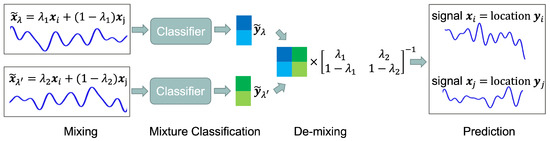 Illustration of the data or feature mixture strategy used for signal prediction. It shows the end-to-end process of mixing, classifying, and de-mixing signals to achieve accurate predictions.