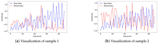 Figure 5 presents the visualization of a raw single sample and a mixed one. After the mixture operation, over 90% of the amplitude values in subcarriers are different from the raw data. Figure 6 shows the visualization of feature maps before and after mixture operations. Figure 6a denotes the raw feature map extracted from the shallow layer of the CANN. Here, this feature map means the output of the last layer of the CANN at the edge, and different colors in this figure denote different values. Figure 6b presents a visualization of the mixed feature maps. The results are obtained by randomly selecting two intermediate feature maps. After this mixture operation, privacy information in the raw feature maps could be hidden. The distribution and patterns have been changed after mixing, regardless of the data or feature maps. Figure 7 illustrates the clustering results of raw data and the mixing data. Through the operations of data and feature mixing, it becomes very hard to separate the data into correct classes (see Figure 7b,d). Since only the edge client holds the coefficient values for mixing and de-mixing, the cloud server has no access to the raw data or features. The third party thus cannot infer the correct behavior, i.e., location and activity, of the target.