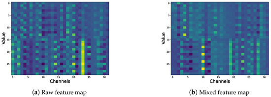 Comparison of raw feature map learned by the P-CA without mixture and the feature map after the mixture operation. (a) shows a visualization of a raw feature map extracted from the shallow layer of the CANN, and (b) presents a random mixed feature map.