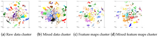 Comparison of raw data cluster and mixed data cluster. (a) Visualization of the cluster results on raw data. (b) Visualization of the cluster results on mixed data. (c) Visualization of the cluster results on raw feature maps. (d) Visualization of the cluster results on mixed feature maps.