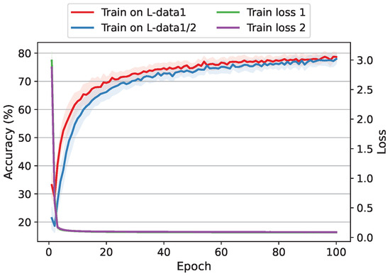 Since P-CA (feature mix) demonstrates the best performance, additional experiments were conducted to evaluate its effectiveness on different datasets. Figure 8 shows the training process of P-CA (feature mix) on L-data1 and L-data1/2. L-data1/2 denotes a combination of L-data1 and L-data2. To assess the stability of the training process, each experiment was repeated 30 times. The bold lines in the figure represent the average accuracy and loss, while the shaded areas indicate the corresponding variances. The small size of the shaded areas suggests that the 30 training iterations are stable.