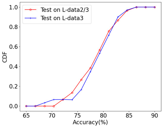 Figure 9 illustrates the cumulative distribution function (CDF) of the 30 testing accuracies of P-CA (feature mix) on L-data2/3 and L-data3. Although both groups of testing accuracies range between 70% and 86%, the results on L-data3 are better. Specifically, the average testing accuracy on L-data3 is 78.6%, which is 5.6% higher than that on L-data2/3. This indicates that P-CA trained on L-data1/2 outperforms the model trained on L-data1 alone. Therefore, combining different datasets, i.e., different targets, may enhance the performance of P-CA.