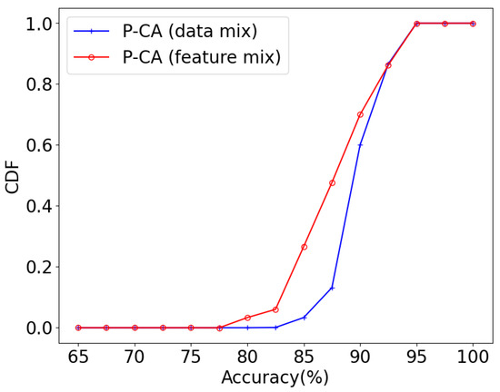 Testing accuracy of P-CA (data mix) and P-CA (feature mix) on activity recognition. Note that the CDF plot is based on tests conducted 30 times.