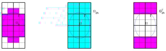 Illustration of definitions of , , , and for domain . Partitions (fine meshes) and (coarse meshes) of domain . Left: elements in (magenta area). Middle: elements in (cobalt blue area). Right: elements in (magenta area).