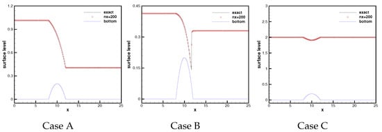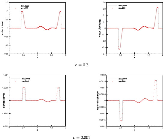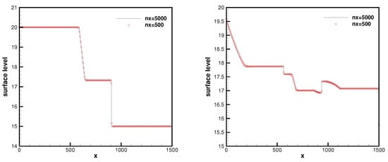 Figure 2 presents the surface level at as well as . Our method works well for this example, producing well-resolved, non-oscillatory solutions using 500 cells which agree with the converged results using 5000 cells. In addition, the numerical results here can be compared with those from [40,41,42].