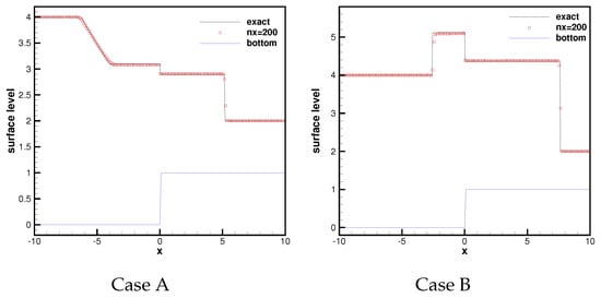 - Case AFurther, we implement an example from [45] with the below initial dataand over a step-like bottomOver time, this example produces a rarefaction moving to the left and a shock moving to the right.