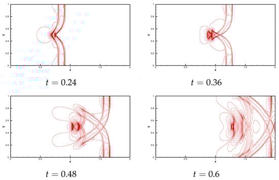 Figure 5 presents thirty contours of the surface level at different ending times and displays the right-going disturbance as it propagates past the hump on cells. It can be observed that small complex features are all obviously resolved by the current method and the results are comparable with those in [38,40,42,46,47].