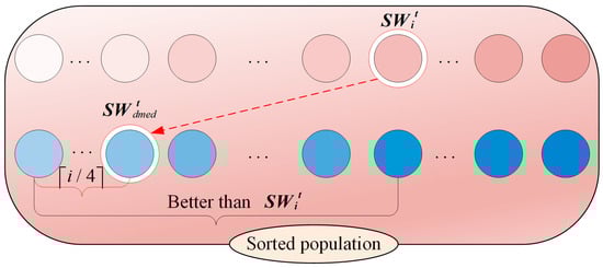 where  denotes the dichotomous median point corresponding to the  individual in the  iteration. The selection of the binary median point is shown in Figure 1, where the darker color represents the larger value of the objective function. Each individual corresponds to a corresponding binary median point, and individuals are always guided by individuals better than themselves, which helps to enhance the exploitation of the algorithm. At the same time, since different individuals have different binary median points, the algorithm exploration ability is also guaranteed during the guidance process. Therefore, the introduction of the dual-median-point guidance strategy in the following and escaping stages of the original SWO guarantees both the convergence speed and accuracy in solving the OAPP problem for mobile robots.