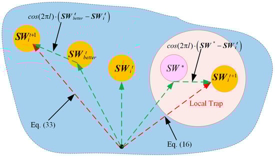 where  denotes the random number generated in the interval [−2, −1]. The search stage is modeled using Equation (9) by Equation (4) and Equation (6) assisting each other to locate the more promising areas.