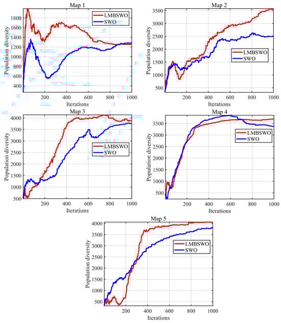 In this section, we mainly analyze the population diversity of the LMBSWO when solving OAPP for mobile robots. Higher population diversity can effectively avoid the algorithm from falling into local stagnation, which enhances the global optimization ability and reduces the probability of falling into local optimal paths. The results of the population diversity experiment are shown in Figure 4, where the X-axis represents the number of iterations and the Y-axis represents the population diversity of the algorithm.