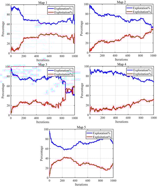 In this section, we focus on analyzing the exploration/exploitation ratio of the LMBSWO for solving OAPP for mobile robots. The exploration ratio characterizes the ability of the algorithm to explore the potential optimal region in the population space, and the higher the ratio, the better the global exploration ability. The exploitation ratio characterizes the ability of the algorithm to dig deeper in the potential optimal region, and the higher the ratio, the better the local search ability. The two phases of exploration and exploitation are complementary to each other. Due to the high complexity of the OAPP problem for mobile robots, we strongly prioritize the exploration ability of the algorithm while improving its exploitation ability as much as possible to achieve optimal solution performance. Figure 5 shows a graph of the exploration and development ratio of the LMBSWO in solving these five maps, with the X-axis indicating the number of iterations and the Y-axis indicating the ratio.