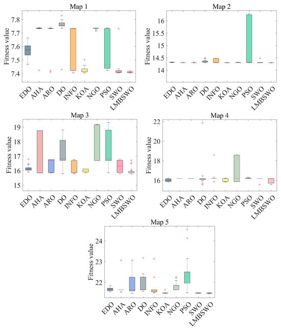 Although the mean results have been analyzed in Section 4.3, the mean analysis only considers the average performance and ignores the variance and distribution of the performance. Therefore, the degree of variance between the 30 independent experiments is considered in this section, and Friedman’s test with a significance factor of 0.05 is used to better help us determine whether there is a significant difference between the different algorithms and to further evaluate LMBSWO’s performance in solving the OAPP for mobile robots. The experimental results are shown in Table 4. From Table 4, it can be seen that in map 1, map 2, map 3, and map 5, the LMBSWO achieves the first place, with an average ranking of 1.65, 1.10, 3.05, and 1.80, respectively. This shows a better global optimization performance compared to other algorithms. Such results are attributed to the fact that the introduction of the learning strategy, the dual median guidance strategy, and the better guidance strategy in the algorithm improves the ability of the algorithm to escape locally optimal paths, which in turn improves the solution performance of the algorithm. In map 4, the LMBSWO ranks third in performance after the EDO and the KOA. This shows that in some specific environments, the performance of the LMBSWO may not be as good as that of other algorithms in solving the OAPP for mobile robots, which suggests that there is still some room for improvement in the LMBSWO. Although the performance of the LMBSWO has some shortcomings in some specific environments, from a comprehensive point of view, the LMBSWO shows the strongest comprehensive global optimal search performance, with an average ranking of 2.29 over five maps, which confirms that the three strategies introduced in this paper help to enhance the algorithm’s ability to escape the locally optimal path when solving the OAPP for mobile robots.