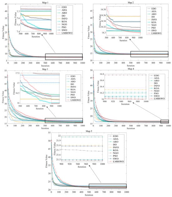 In this section, the convergence behavior of the algorithm in solving the OAPP for mobile robots in different map environments is analyzed to truly reflect the real convergence characteristics of the LMBSWO. Figure 8 shows the experimental results, where the X-axis represents the number of iterations, and the Y-axis represents the fitness value (path length). From the figure, it can be seen that as the number of iterations increases, the fitness values of all the algorithms are decreasing. Meanwhile, the other algorithms have a better convergence speed compared to the LMBSWO, which is mainly due to the fact that the LMBSWO adopts a better exploratory technique, which results in a certain loss in convergence speed. However, after about 400 iterations, all the other algorithms fall into local optimal paths, and the change of the fitness value stays on a horizontal line, which is mainly due to the inability of the other algorithms to explore the local optimal region effectively, causing them to fall into the local optimum, and this phenomenon becomes more and more serious with the increase in the complexity of the map environment. However, the LMBSWO maintains a continuous optimization in most of the maps, i.e., the fitness value is continuously optimized as the number of iterations increases, which indicates that, as the maps become progressively more complex, the LMBSWO is able to effectively cope with the challenge of falling into locally optimal paths. The above convergence phenomenon is mainly due to the introduction of the learning strategy and the better guidance strategy, which greatly improves the global search performance of the algorithm and enhances the ability of the algorithm to avoid the locally optimal paths. In addition, despite the slowdown in convergence speed, the LMBSWO is able to continue to optimize the shortest paths in solving the OAPP for mobile robots. Compared with other state-of-the-art algorithms in optimizing the shortest path, the LMBSWO shows stronger global optimization ability, as well as stronger optimization stability.